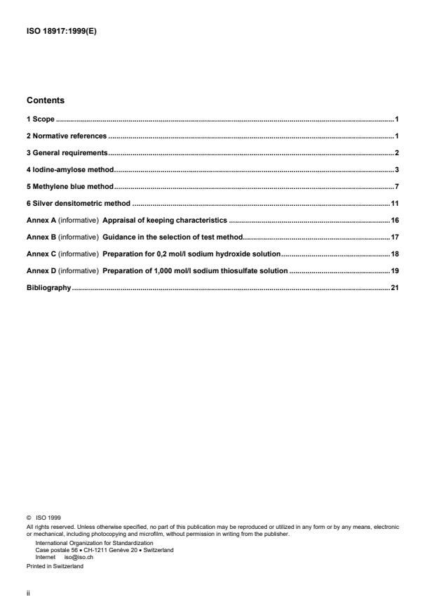 ISO 18917:1999 is a standard published by the International Organization for Standardization (ISO). Its full title is "Photography - Determination of residual thiosulfate and other related chemicals in processed photographic materials - Methods using iodine-amylose, methylene blue and silver sulfide". This standard covers: 1.1 This International Standard specifies test methods for the determination of residual thiosulfate and other related chemicals in processed photographic materials. 1.2 This International Standard applies to silver halide/gelatin products that have been processed with a final thiosulfate fixing bath and a water wash. This International Standard does not apply to stabilised black-and-white products, thermally processed films, or instant-type products. The procedures given in this International Standard measure residual thiosulfate, and the silver densitometric method measures residual related polythionate materials as well. Measurements carried out by the procedures in this International Standard may, within the limitations stated in annexes A and B, correlate with the image stabilities of processed photographs. 1.3 Film or plates with photographic-sensitive layers on both sides, or with a photographic sensitive layer on one side and a gelatin backing layer on the reverse side, may contain approximately twice as much thiosulfate after processing as samples having a coating on one side only. This situation will be true for materials for which residual thiosulfate is determined by the iodine-amylose or methylene blue procedures. NOTE For the method of reporting such results, see figure 1, example 2. 1.4 The iodine-amylose can be used with fibre-based paper, resin-coated paper, films and plates. It is the method to be used with films and papers containing incorporated developing agents. 1.5 The methylene blue method can be used with fibre-based paper, resin-coated paper, films and plates but not with films and paper containing incorporated developing agents. 1.6 The silver sulfide densitometric method measures thiosulfates, polythionates and all other residual chemicals in a processed product that react with silver ion to form a silver "stain" under the conditions of the test. 1.7 A tabulated summary of methods, scope, etc. is given in annex B.