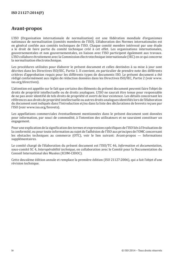 L'ISO 21127:2014 fixe des lignes directrices pour l'échange d'informations entre institutions patrimoniales. En termes simples, on peut dire qu'il s'agit de l'information gérée par les musées, les bibliothèques et les archives. Le domaine d'application visé par l'ISO 21127:2014 porte sur l'échange et l'intégration de la documentation scientifique hétérogène relative aux collections muséales. Cette définition appelle un développement.