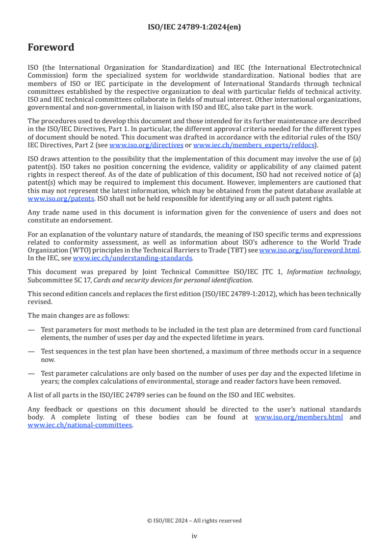 ISO/IEC 24789-1:2024 is a standard published by the International Organization for Standardization (ISO). Its full title is "Identification cards - Card service life - Part 1: Application profiles and requirements". This standard covers: This document comprises a methodology for determining a test plan to simulate a card's service life. The methodology defines two parameters of card service life: the expected card service life in years and the average number of uses per day. This document and ISO/IEC 24789-2, together along with ISO/IEC 10373-1 describe the evaluation methods to be used and their criteria. This document was originally developed for ID-1 cards conforming to ISO/IEC 7810 but can be useful in whole or in part for other types and form factors.