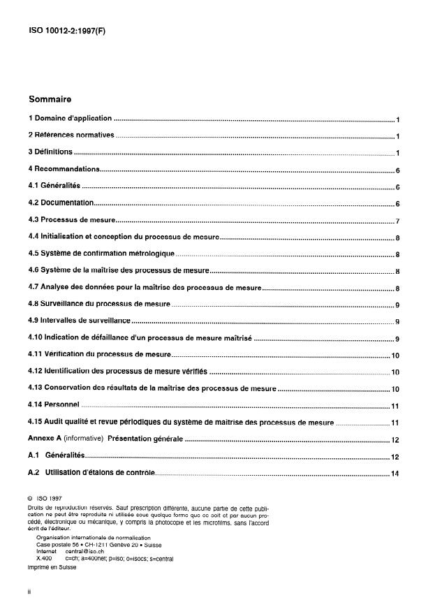 ISO 10012-2:1997 is a standard published by the International Organization for Standardization (ISO). Its full title is "Quality assurance for measuring equipment — Part 2: Guidelines for control of measurement processes". This standard covers: 1.1 La présente partie de l'ISO 10012 comporte des recommandations en matière d'assurance de la qualité applicables par un Fournisseur pour s'assurer de manière accrue que les mesurages sont effectués avec l'exactitude voulue. Elle contient également des lignes directrices concernant la mise en oeuvre de ces recommandations. 1.2 La présente partie de l'ISO 10012 a aussi pour but d'être utilisée comme un guide pour le management de la qualité ou comme un document d'exigences par accord entre le Fournisseur et l'Acheteur. 1.3 La présente partie de l'ISO 10012 est applicable aux processus de mesure. Elle traite des éléments pouvant influer sur les résultats des mesurages, tels que les modes opératoires de mesure, le personnel, etc., qui ne sont pas développés dans le détail dans l'ISO 10012-1. 1.4 La présente partie de l'ISO 10012 est applicable -- aux organismes qui utilisent le mesurage pour démontrer la conformité à des exigences spécifiées; -- aux Fournisseurs de produits qui mettent en oeuvre un système qualité dans lequel les résultats des mesurages sont utilisés pour démontrer la conformité à des exigences spécifiées; ceci inclut les systèmes qualité qui satisfont aux exigences de l'ISO 9001, l'ISO 9002 et l'ISO 9003. 19