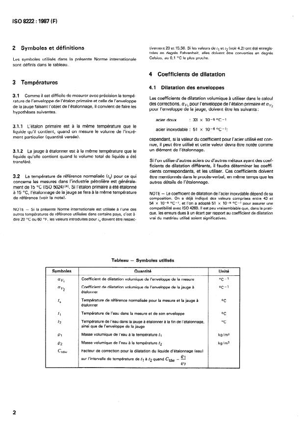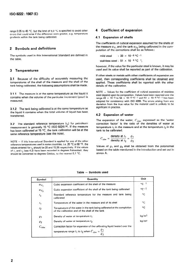 ISO 8222:1987 is a standard published by the International Organization for Standardization (ISO). Its full title is "Petroleum measurement systems — Calibration — Temperature corrections for use with volumetric reference measuring systems". This standard covers: Gives multiplication factors for the correction of the volume of water transferred from a primary measure to a tank for differences in volume arising from temperature differences during the determination of the capacity of the tank at a reference temperature. The corrections apply for temperatures in the range O,O5 to 45 °C, but the difference between the temperature of the measure and of the tank shall not be more than 5,0 °C, unless otherwise specified in the calibration procedure.