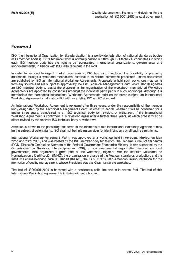 IWA 4:2005 is a standard published by the International Organization for Standardization (ISO). Its full title is "Quality management systems — Guidelines for the application of ISO 9001:2000 in local government". This standard covers: The objective of International Workshop Agreement IWA 4:2005 is to provide local governments with guidelines for the voluntary application of ISO 9001:2000 on an integral basis. These guidelines do not, however, add, change or modify the requirements of ISO 9001:2000. For a local government to be considered reliable, it should guarantee minimum conditions of reliability for the processes that are necessary to provide all the services needed by its citizens in a consistent and reliable manner. All the local government's processes, including management, core, operational and support processes, should constitute a single, integral, quality management system. The integral character of this system is important because, otherwise, although a local government could be reliable in some areas of activity, it may be unreliable in others. For a government to be considered reliable, it should guarantee minimum conditions of reliability for all key processes and services. To achieve this, it is advisable that the local government clearly identify the management, core and support processes that, together, make it reliable (see Annex A). Annex B provides a diagnostic tool for local governments to evaluate the scope and maturity of their processes and services.