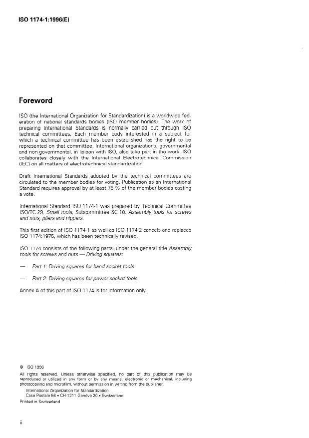 ISO 1174-1:1996 is a standard published by the International Organization for Standardization (ISO). Its full title is "Assembly tools for screws and nuts — Driving squares — Part 1: Driving squares for hand socket tools". This standard covers: Specifies the dimensions and designation of driving squares for hand socket tools.