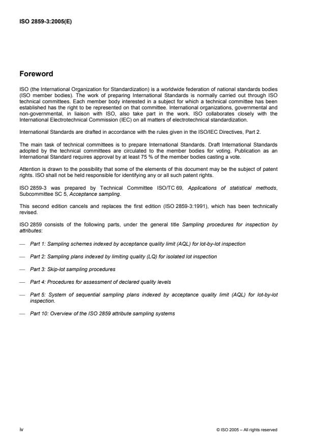ISO 2859-3:2005 is a standard published by the International Organization for Standardization (ISO). Its full title is "Sampling procedures for inspection by attributes — Part 3: Skip-lot sampling procedures". This standard covers: ISO 2859-3:2005 specifies generic skip-lot sampling procedures for acceptance inspection by attributes. The purpose of these procedures is to provide a way of reducing the inspection effort on products of high quality submitted by a supplier who has a satisfactory quality assurance system and effective quality controls. The reduction in inspection effort is achieved by determining at random, with a specified probability, whether a lot presented for inspection will be accepted without inspection. This procedure extends the principle of the random selection of sample items already applied in ISO 2859-1 to the random selection of lots. The skip-lot sampling procedures specified in ISO 2859-3:2005 are applicable to, but not limited to, inspection of end items, such as complete products or sub-assemblies, components and raw materials, and materials in process.