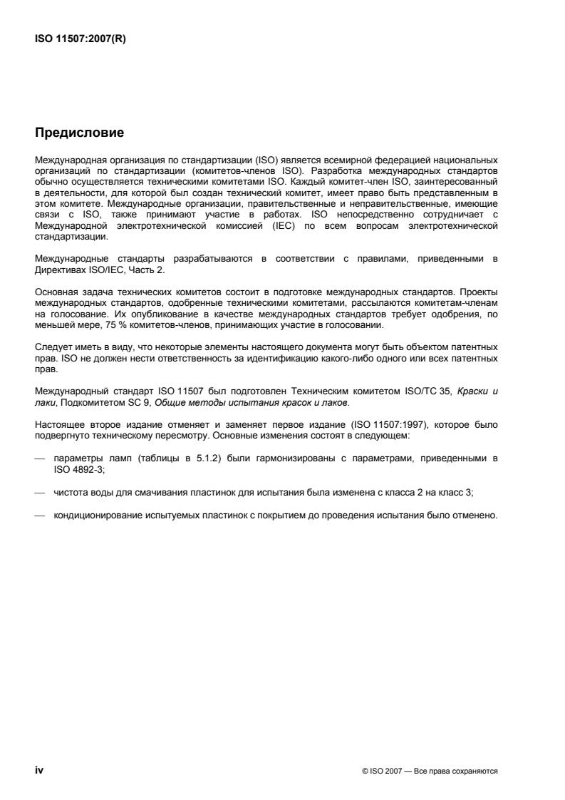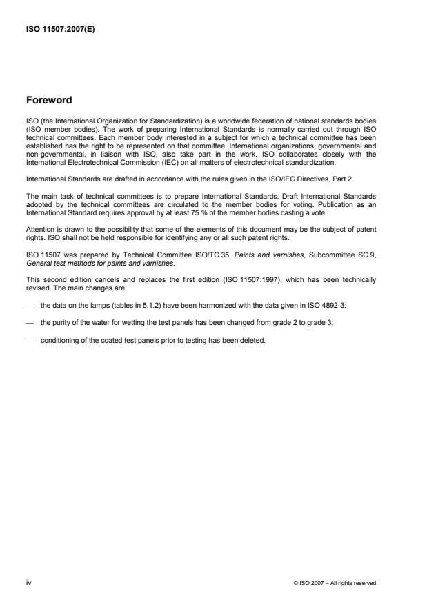 ISO 11507:2007 is a standard published by the International Organization for Standardization (ISO). Its full title is "Paints and varnishes — Exposure of coatings to artificial weathering — Exposure to fluorescent UV lamps and water". This standard covers: ISO 11507:2007 specifies exposure conditions for paint coatings exposed to artificial weathering in apparatus including fluorescent UV lamps and condensation or water spray. The effects of weathering are evaluated separately by comparative testing of chosen parameters.