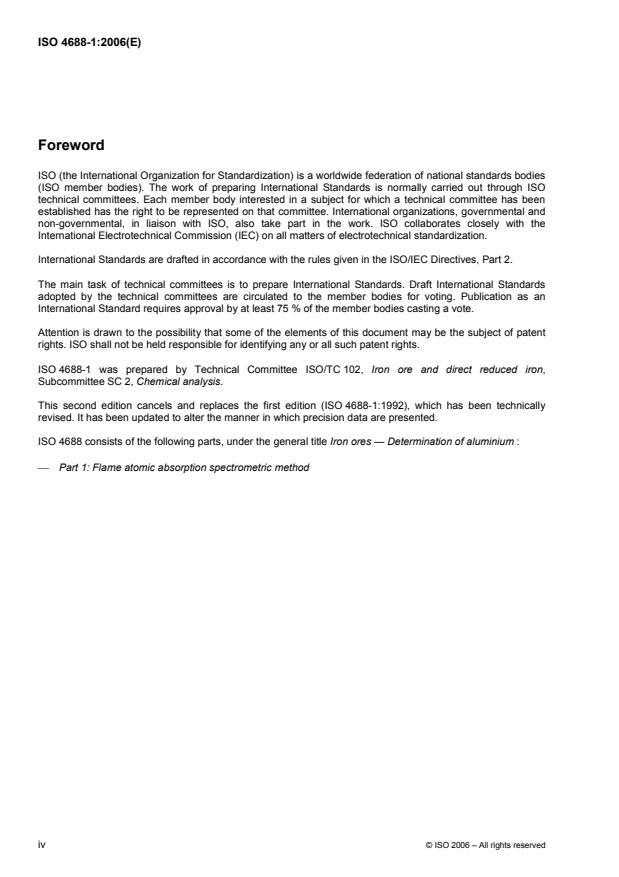 ISO 4688-1:2006 is a standard published by the International Organization for Standardization (ISO). Its full title is "Iron ores — Determination of aluminium — Part 1: Flame atomic absorption spectrometric method". This standard covers: ISO 4688-1:2006 specifies a flame atomic absorption spectrometric method for the determination of the mass fraction of aluminium in iron ores. This method is applicable to mass fractions of aluminium between 0,1 % and 5,0 % in natural iron ores, iron ore concentrates and agglomerates, including sinter products.