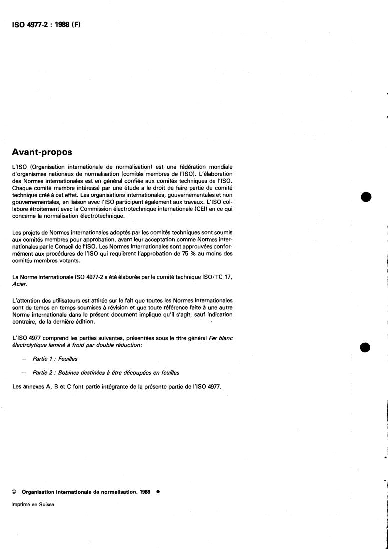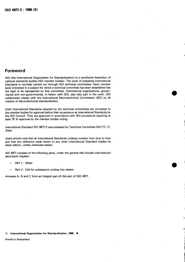 ISO 4977-2:1988 is a standard published by the International Organization for Standardization (ISO). Its full title is "Double cold-reduced electrolytic tinplate — Part 2: Coil for subsequent cutting into sheets". This standard covers: Double cold-reduced electrolytic tinplate — Part 2: Coil for subsequent cutting into sheets