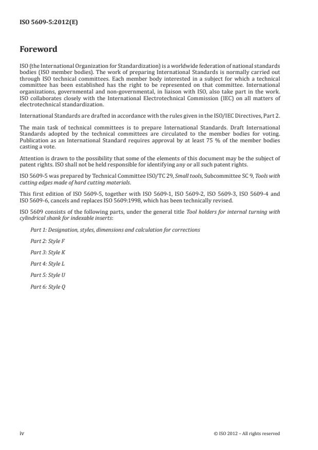 ISO 5609 5:2012 specifies the characteristics of tool holders for internal turning with cylindrical shank, style U, i. e. with reduced shank and cutting edge angle equal to 93°. These tool holders are primarily intended for indexable inserts made of hardmetal, ceramic or other cutting materials to be mounted by clamping and to be used for internal turning operations.