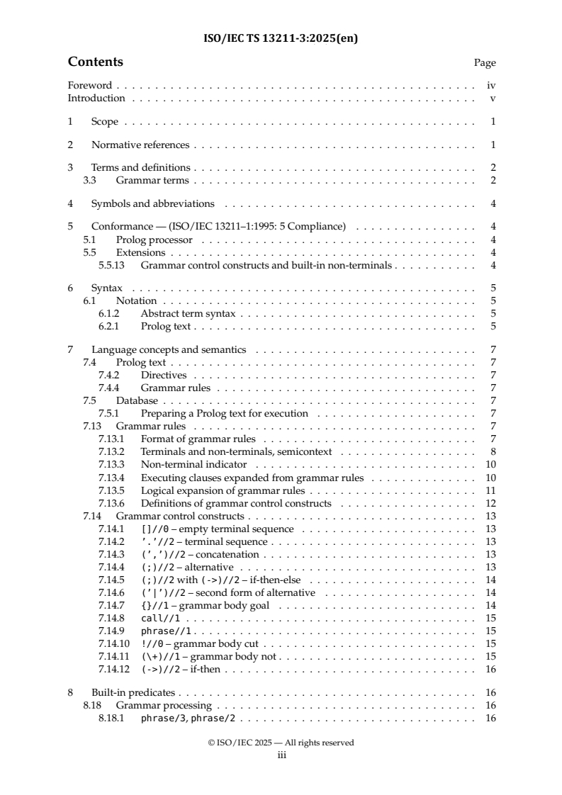 This document promotes the applicability and portability of Prolog grammar rules in data processing systems that support standard Prolog as defined in ISO/IEC 13211–1:1995/Cor 1:2007/Cor 2:2012/Cor 3:2017 and ISO/IEC 13211–2:2000. This document specifies: a) The representation, syntax, and constraints of Prolog grammar rules b) A logical expansion of grammar rules into Prolog clauses c) A set of built-in predicates for parsing with grammar rules