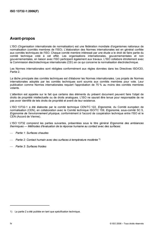 L'ISO 13732-1:2006 donne les valeurs seuil de température auxquelles des brûlures interviennent lorsque la peau de l'être humain entre en contact avec une surface solide chaude. Elle décrit également des méthodes permettant d'évaluer les risques de brûlure lorsque des personnes peuvent toucher des surfaces chaudes sans que leur peau ne soit protégée. L'ISO 13732-1:2006 indique dans quels cas il est nécessaire de spécifier des valeurs limites de température pour des surfaces chaudes, mais n'établit nullement ces valeurs limites de température des surfaces. L'ISO 13732-1:2006 concerne des durées de contact de 0,5 s et plus. Elle est applicable aux contacts lorsque la température de surface est essentiellement maintenue durant le contact. Elle n'est pas applicable aux contacts d'une surface importante de la peau (c'est-à-dire environ 10 % ou plus de la peau de l'ensemble du corps) avec la surface chaude. Elle ne s'applique pas non plus dans les cas de contacts de plus de 10 % de la tête ou de contacts susceptibles d'engendrer des brûlures des zones vitales du visage. L'ISO 13732-1:2006 est applicable aux surfaces chaudes de toutes sortes d'objets: équipements, produits, bâtiments, objets naturels, etc. Par souci de simplification, elle ne mentionne que les produits, mais elle est également applicable à tous les autres objets. Elle est aplicable à des produits utilisés dans n'importe quel environnement, par exemple sur les lieux de travail, au domicile. Elle est applicable à des surfaces chaudes de produits qui peuvent être touchés par des adultes en bonne santé, des enfants, des personnes âgées et des personnes physiquement handicapées. L'ISO 13732-1:2006 ne fournit pas de données concernant la protection contre l'inconfort ou la douleur.