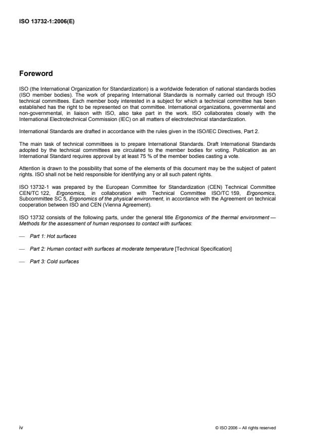 ISO 13732-1:2006 is a specification that provides guidance for assessing the risks of burns caused by contact with hot surfaces. It sets temperature threshold values for burns and describes methods for assessing these risks. The standard applies to contact periods of 0.5 seconds or longer and when the surface temperature remains constant during contact. It does not apply to contact with large areas of skin, more than 10% of the head, or contact that could result in burns to vital areas of the face. This standard is applicable to all kinds of objects, including equipment, products, buildings, and natural objects. It applies to all individuals, including healthy adults, children, the elderly, and people with disabilities. However, it does not provide data for protection against discomfort or pain.