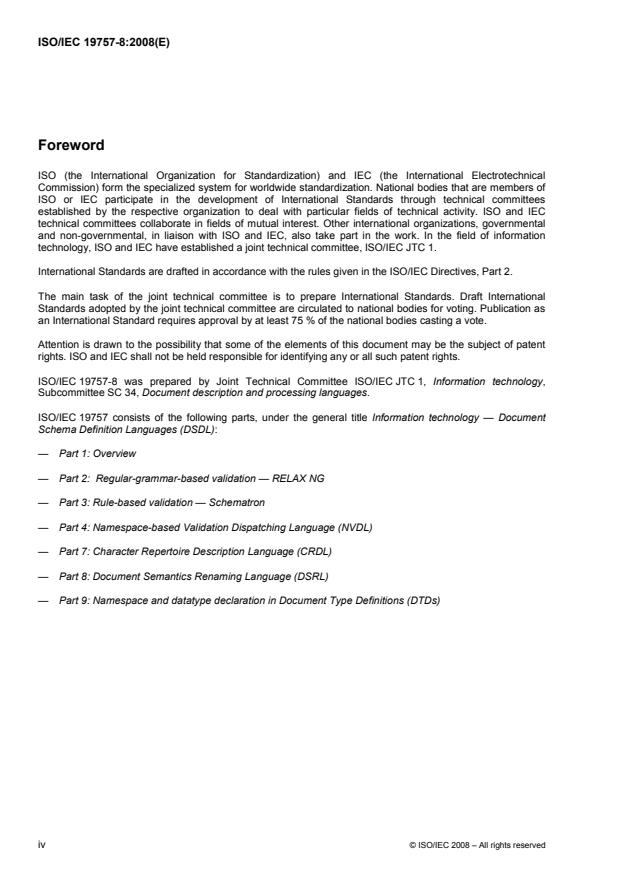ISO/IEC 19757-8:2008 is a standard published by the International Organization for Standardization (ISO). Its full title is "Information technology — Document Schema Definition Languages (DSDL) — Part 8: Document Semantics Renaming Language (DSRL)". This standard covers: ISO/IEC 19757-8:2008 specifies a mechanism that allows users to assign locally meaningful names to XML elements, attributes, entities and processing instructions, without having to completely rewrite the Document Type Definition (DTD) or schema against which they are to be validated. In addition, ISO/IEC 19757-8:2008 provides an XML-based format for declaring the replacement text for entity references and provides a mechanism that allows users to define default values for both element content and attribute values.