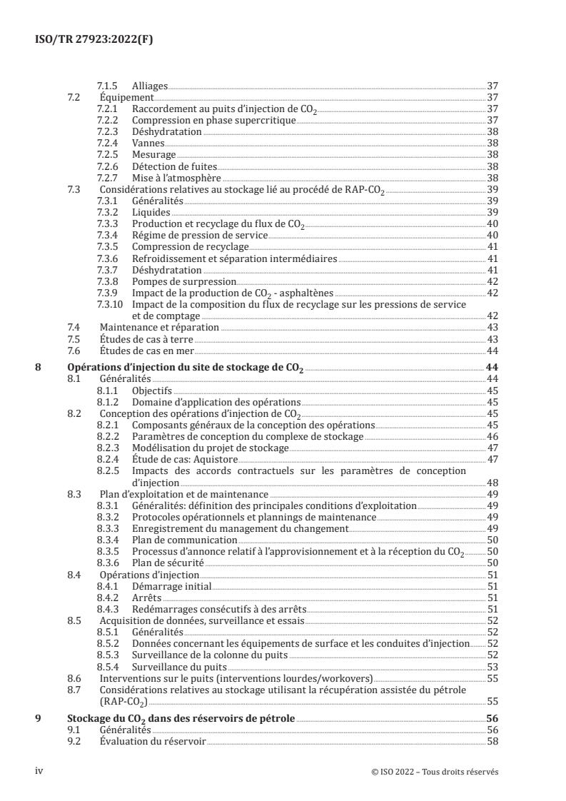 Le présent document couvre les points suivants: — une description du cadre légal existant ainsi que des lois et directives associées couvrant les projets actuels et planifiés; — des informations spécifiques sur les installations d’injection de CO2 fondées sur les projets existants et planifiés qui incluent le stockage du CO2 dans les aquifères d’eau saline et la RAP-CO2, selon le cas. Ces informations portent notamment sur les matériaux utilisés, les infrastructures de surface, les considérations relatives à la conception des puits, les concepts relatifs aux stratégies de positionnement des puits, les considérations relatives au déploiement des outils de surveillance en fond de puits, les complétions des puits ainsi que les pratiques de maintenance et de réparation des infrastructures et des puits; — les descriptions des pratiques actuelles dans le cadre des projets opérationnels incluant les activités de surveillance, de sécurité et d’établissement de rapports associées aux composants en surface et en fond de puits de projets; — une discussion sur les aspects opérationnels du stockage de CO2 dans les réservoirs d’hydrocarbures, y compris les champs gazéifères déplétés et les installations de réutilisation; — une description des exigences et méthodes de surveillance, y compris les mesurages, afin d’établir les états initiaux (lignes de base); — une description des outils nouveaux et existants, de leur précision et des attentes en matière de quantification; — une description des exigences réglementaires relatives à l’exploitation et au démantèlement d’un projet de RAP-CO2 ainsi que des projets de CSC et de stockage associé dans le monde; — une description des activités de démantèlement et des échéances associées à la fin d’un projet.