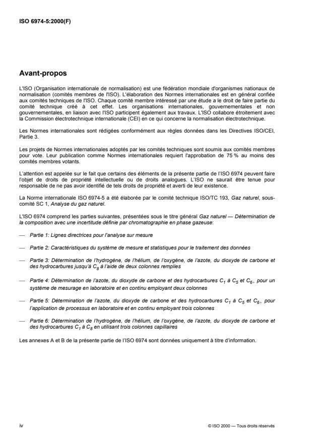 ISO 6974-5:2000 is a standard published by the International Organization for Standardization (ISO). Its full title is "Natural gas — Determination of composition with defined uncertainty by gas chromatography — Part 5: Determination of nitrogen, carbon dioxide and C1 to C5 and C6+ hydrocarbons for a laboratory and on-line process application using three columns". This standard covers: L'ISO 6974-5:2000 décrit une méthode par chromatographie en phase gazeuse pour la détermination quantitative de constituants du gaz naturel à l'aide d'un système à trois colonnes. Cette méthode est applicable aux gaz naturels de plage limitée, utilisés régulièrement pour l'étalonnage en ligne et automatique d'échantillons de gaz ne contenant pas de condensats d'hydrocarbures et/ou d'eau. Elle est applicable à l'analyse de gaz contenant des constituants dans les limites des gammes de fractions molaires indiquées au Tableau 1 de l'ISO 6974-5:2000. Ces gammes ne représentent pas les limites de détection, mais les limites à l'intérieur desquelles s'applique la fidélité spécifiée de la méthode. Même si la présence d'un ou plusieurs constituants d'un échantillon est susceptible de ne pas être détectée, la méthode peut tout de même être applicable. L'ISO 6974-5:2000 n'est applicable que conjointement avec l'ISO 6974-1 et l'ISO 6974-2.