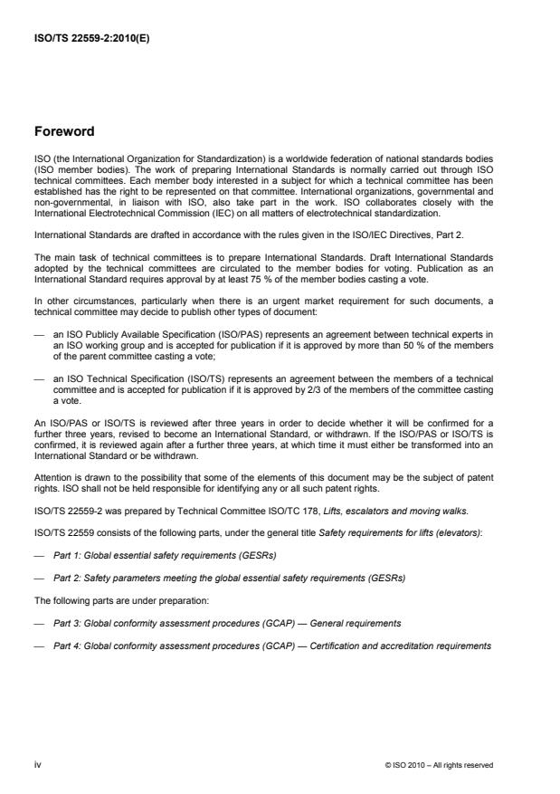 ISO/TS 22559-2:2010 is a technical specification published by the International Organization for Standardization (ISO). Its full title is "Safety requirements for lifts (elevators) — Part 2: Safety parameters meeting the global essential safety requirements (GESRs)". This standard covers: ISO/TS 22559-2:2010 specifies global safety parameters (GSPs) for lifts (elevators), their components and their functions, and complements the system and methods specified in ISO/TS 22559-1 for mitigating safety risks that can arise in the course of the operation and use of, or work on, lifts (elevators). ISO/TS 22559-2:2010 is applicable to lifts that can a) be located in any permanent and fixed structure within or attached to a building, except lifts located in private residences (single family units) or means of transport, e.g. ships, b) have any rated load, size of load-carrying unit and speed, and travel distance and number of landings, c) be affected by fire in the load-carrying unit, earthquakes, weather or floods, and d) be foreseeably misused (e.g. overloaded), but not vandalized.