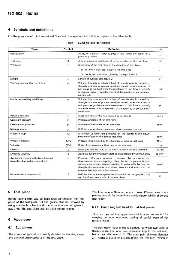 ISO 4022:1987 is a standard published by the International Organization for Standardization (ISO). Its full title is "Permeable sintered metal materials — Determination of fluid permeability". This standard covers: This second edition cancels and replaces the first edition (i. e. ISO 4022:1977). The test is carried out under such conditions that the fluid permeability can be expressed in terms of viscous and inertia permeability coefficients (see annex A). Does not apply to very long hollow cylindrical test pieces of small diameter. Annex B gives test fluids.