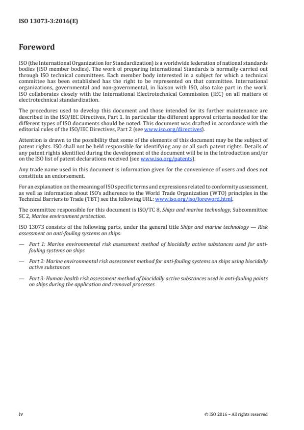 ISO 13073-3:2016 is a standard published by the International Organization for Standardization (ISO). Its full title is "Ships and marine technology - Risk assessment on anti-fouling systems on ships - Part 3: Human health risk assessment method of biocidally active substances used in anti-fouling paints on ships during the application and removal processes". This standard covers: ISO 13073-3:2016 specifies a method of human health risk assessment that enables the evaluation of anti-fouling paint application and removal in order to determine if the product can be used safely where users are at risk of being exposed to biocidally active substances contained within anti-fouling paints. This can be used for a risk assessment to determine the impact(s), if any, on professional or non-professional operators. ISO 13073-3:2016 does not specify a specific test method for evaluation of hazard and toxicity or recommend usage restrictions of certain substances. NOTE 1 ISO 13073-3:2016 is a "minimum" method, i.e. additional regulations or assessments based on national needs can be warranted. NOTE 2 While the approach prescribed is a tiered system, studies required in higher tiers can be undertaken in lieu of equivalent lower tier studies.