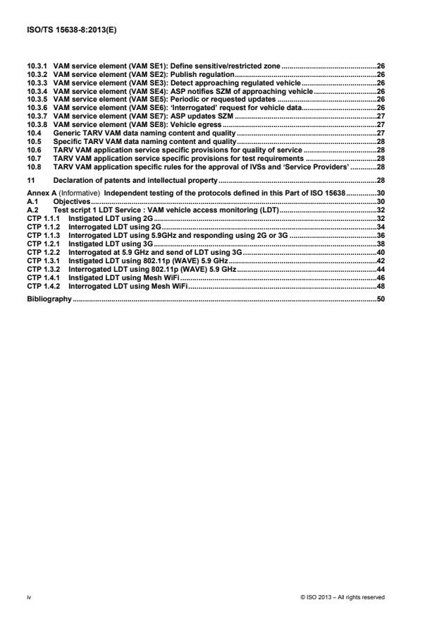 ISO/TS 15638-8:2013 is a technical specification published by the International Organization for Standardization (ISO). Its full title is "Intelligent transport systems — Framework for collaborative Telematics Applications for Regulated commercial freight Vehicles (TARV) — Part 8: Vehicle access monitoring (VAM)". This standard covers: ISO/TS 15638-8:2013 addresses the provision of ?Vehicle Access Management' (and monitoring) and specifies the form and content of such data required to support such systems, and access methods (4.3) to that data. ISO/TS 15638-8:2013 provides specifications (4.50) for common communications and data exchange aspects of the application service (4.6) vehicle access monitoring that a regulator (4.43) may elect to require or support as an option, including: a) high level definition of the service that a service provider (4.48) has to provide, (The service definition describes common service elements; but does not define the detail of how such an application service (4.6) is instantiated, not the acceptable value ranges of the data concepts defined) b) means to realise the service c) application data, naming content and quality that an IVS (4.29) has to deliver. The definition of what comprises a ?regulated' service is regarded as an issue for national decision, and may vary from jurisdiction (4.33) to jurisdiction. This document does not impose any requirements on nations in respect of which services for regulated vehicles jurisdictions will require, or support as an option, but provides standardised sets of requirements descriptions for identified services to enable consistent and cost efficient implementations where instantiated. ISO 15638 has been developed for use in the context of regulated commercial freight vehicles [hereinafter referred to as 'regulated vehicles' (4.42)]. There is nothing, however, to prevent a jurisdiction extending or adapting the scope to include other types of regulated vehicles, as it deems appropriate.