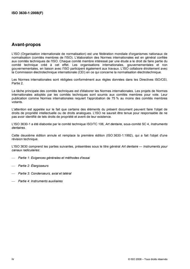 L'ISO 3630-1:2007 spécifie les exigences générales et les méthodes d'essai relatives aux instruments pour canaux radiculaires utilisés en endodontie, par exemple élargisseurs, instruments de mise en forme et de nettoyage, condenseurs et instruments auxiliaires. En outre elle couvre les désignations générales de dimensions, le code des couleurs, l'emballage et les symboles d'identification.