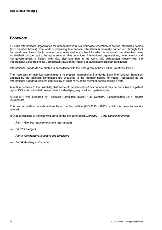 ISO 3630-1:2008 specifies general requirements and test methods for root-canal instruments used for endodontic purposes, e.g. enlargers, shaping and cleaning instruments, condensers, and accessory instruments. In addition it covers general size designations, colour coding, packaging and identification symbols.