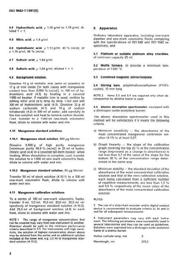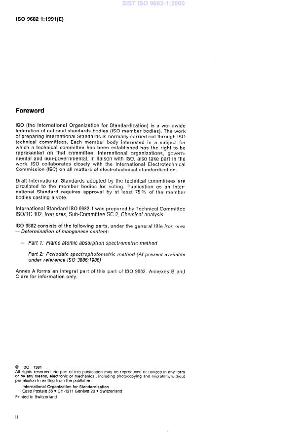 ISO 9682-1:1991 is a standard published by the International Organization for Standardization (ISO). Its full title is "Iron ores — Determination of manganese content — Part 1: Flame atomic absorption spectrometric method". This standard covers: The specified method applies to manganese contents between 0,01 % (m/m) and 3 % (m/m) in natural iron ores, iron ore concentrates and agglomerates, including sinter products. Annex A forms an integral part of this standard. Annexes B and C are for information only.