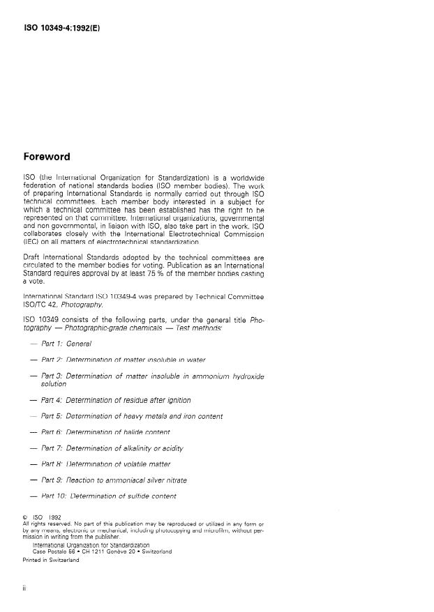Keywords: ISO 10349-4:1992, residue after ignition, photographic-grade chemicals, ignition crucible, muffle furnace, desiccator, test method, photography quality control.