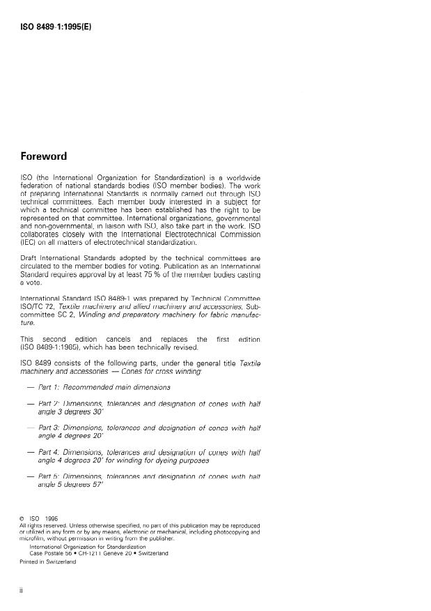 ISO 8489-1:1995 is a standard published by the International Organization for Standardization (ISO). Its full title is "Textile machinery and accessories — Cones for cross winding — Part 1: Recommended main dimensions". This standard covers: Contains recommended types of cones (values of half angles, lengths and large inner diameters) used in the field of textile industry.