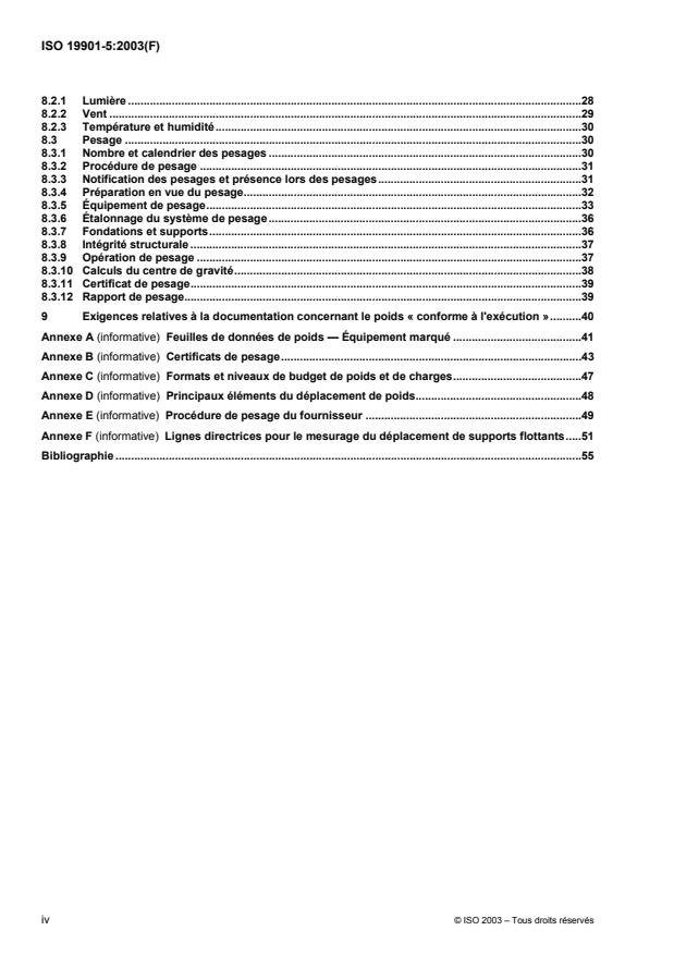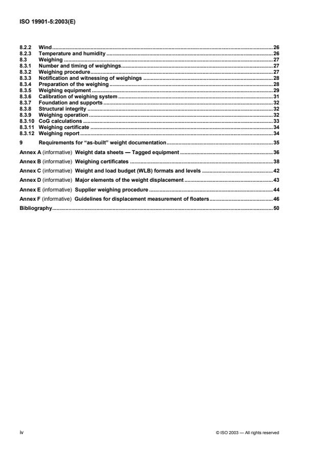 ISO 19901-5:2003 is a standard published by the International Organization for Standardization (ISO). Its full title is "Petroleum and natural gas industries — Specific requirements for offshore structures — Part 5: Weight control during engineering and construction". This standard covers: ISO 19901-5:2003 specifies requirements for controlling the weight and centre of gravity (CoG) by means of mass management during the engineering and construction of structures for the offshore environment. The provisions are applicable to offshore projects that include structures of all types and materials. ISO 19901-5:2003 differentiates between projects where considerations with regard to weight and CoG have a high priority as a result of weight and/or CoG sensitivity, and projects where weight and CoG are of little consequence. This differentiation has been made by the introduction of three different classes of structure (Class A, Class B and Class C). Depending on the degree of control necessary, different clauses of ISO 19901 will apply; clause 4 provides guidelines for assigning one of these classes. ISO 19901-5:2003 specifies quality requirements for reporting of weights and centres of gravity, specifies requirements for weight reporting, provides a basis for overall project status reports or management reports for all classes, specifies requirements for weight and load budgets for offshore installations, specifies the methods and requirements for the weighing of major assemblies and the determination of weight and centre of gravity, specifies requirements for weight information from suppliers, including weighing of equipment and bulk materials for offshore installations. It may be used as a basis for planning and presentation of the contractor's weight-reporting system; as a basis for evaluation of the contractor's weight-reporting system; as a means of refining the structural analysis/model; as a contract reference between the ordering client and the contractor; and as a basis for costing.