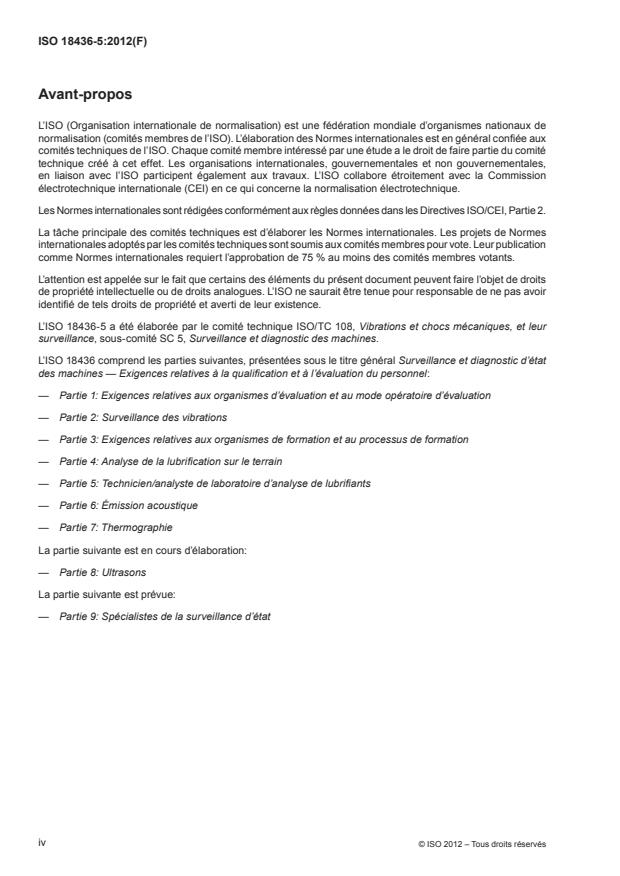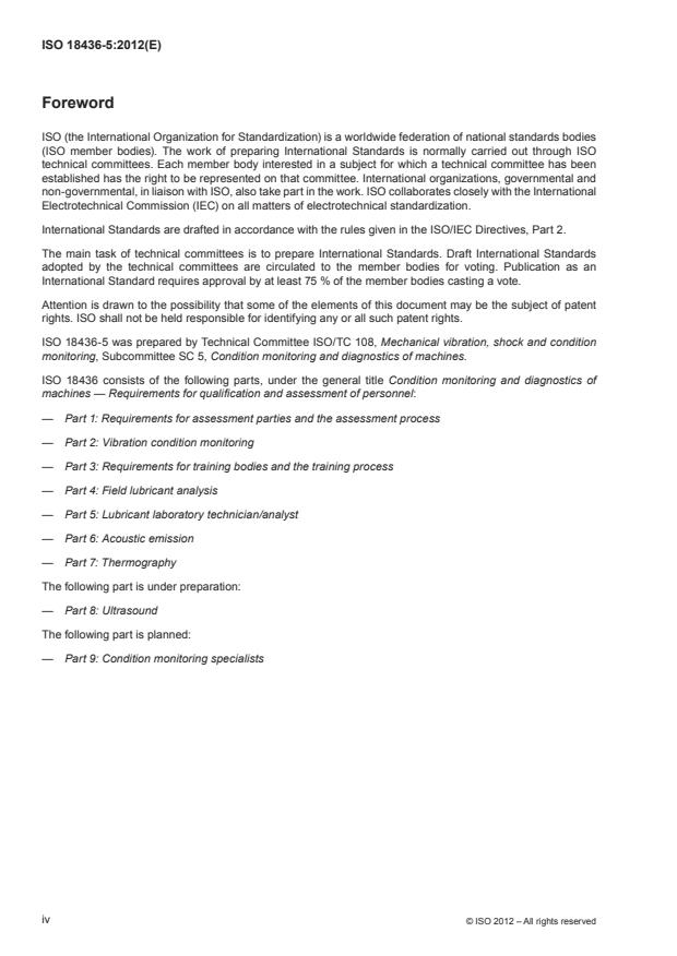 ISO 18436-5:2012 is a standard published by the International Organization for Standardization (ISO). Its full title is "Condition monitoring and diagnostics of machines - Requirements for qualification and assessment of personnel - Part 5: Lubricant laboratory technician/analyst". This standard covers: ISO 18436-5:2012 specifies the requirements for qualification and assessment of personnel who perform machinery condition monitoring and diagnostics using laboratory-based lubricant analysis. A certificate or declaration of conformity to ISO 18436-5:2012 provides recognition of the qualifications and competence of individuals to perform laboratory-based lubricant analysis for machinery condition monitoring. It is possible that this procedure is not applicable to specialized equipment or other specific situations. ISO 18436-5:2012 covers a three-category classification programme that is based on the technical areas delineated herein.