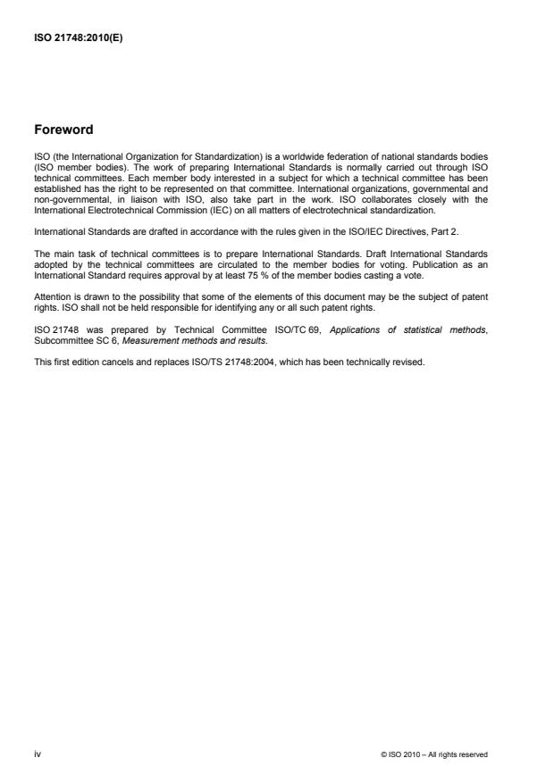 ISO 21748:2010 gives guidance for evaluation of measurement uncertainties using data obtained from studies conducted in accordance with ISO 5725-2:1994; comparison of collaborative study results with measurement uncertainty (MU) obtained using formal principles of uncertainty propagation. (ISO 5725-3:1994 provides additional models for studies of intermediate precision. However, while the same general approach may be applied to the use of such extended models, uncertainty evaluation using these models is not incorporated in ISO 21748:2010.) ISO 21748:2010 is applicable in all measurement and test fields where an uncertainty associated with a result has to be determined. It does not describe the application of repeatability data in the absence of reproducibility data. ISO 21748:2010 assumes that recognized, non-negligible systematic effects are corrected, either by applying a numerical correction as part of the method of measurement, or by investigation and removal of the cause of the effect. The recommendations in ISO 21748:2010 are primarily for guidance. It is recognized that while the recommendations presented do form a valid approach to the evaluation of uncertainty for many purposes, it is also possible to adopt other suitable approaches. In general, references to measurement results, methods and processes in ISO 21748:2010 are normally understood to apply also to testing results, methods and processes.