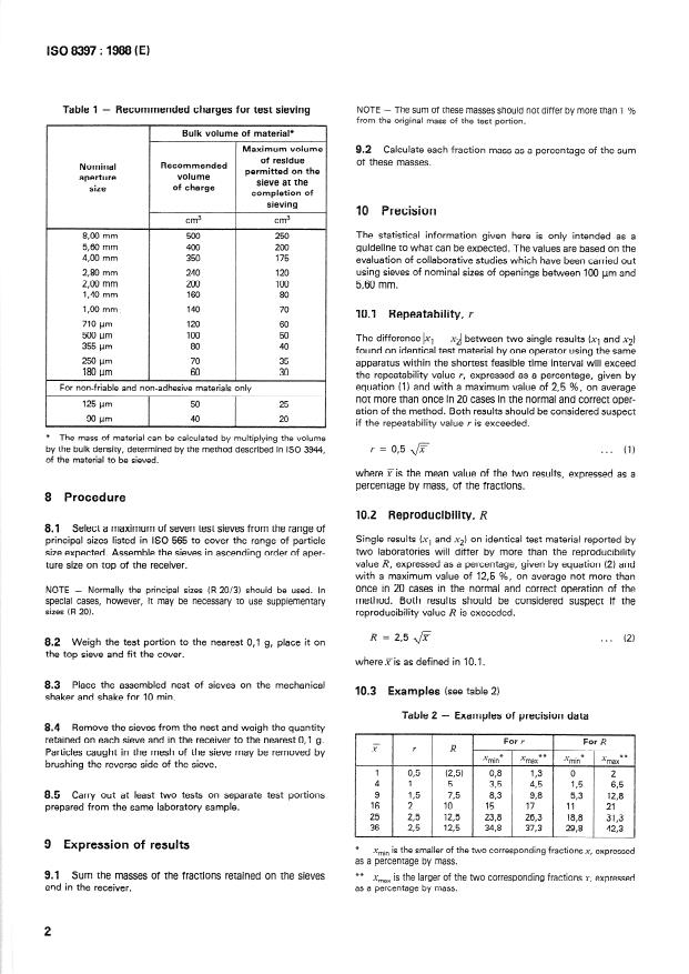 ISO 8397:1988 is a standard published by the International Organization for Standardization (ISO). Its full title is "Solid fertilizers and soil conditioners — Test sieving". This standard covers: Specifies a method for the determination of a particle size distribution, consisting in mechanical dry sieving of a sample with one or more test sieves.The second edition cancels and replaces the first edition (1986), clause 10 of which has been amended.