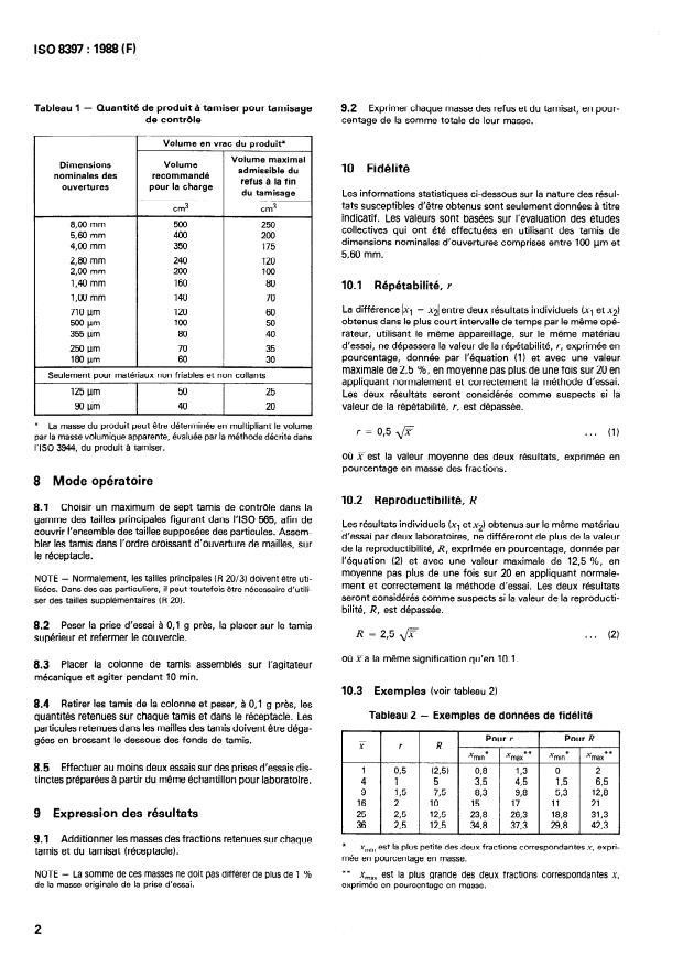 Tableau 1 - Quantité de produit à tamiser pour tamisage 9.2 Exprimer chaque masse des refus et du tamisat, en pour-