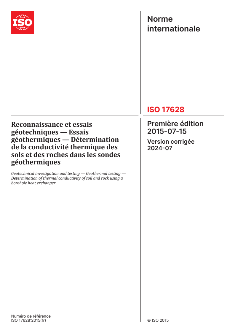 ISO 17628:2015 - Reconnaissance et essais géotechniques — Essais géothermiques — Détermination de la conductivité thermique des sols et des roches dans les sondes géothermiques/5/2024