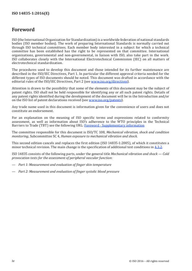 ISO 14835-1:2016 is a standard published by the International Organization for Standardization (ISO). Its full title is "Mechanical vibration and shock — Cold provocation tests for the assessment of peripheral vascular function — Part 1: Measurement and evaluation of finger skin temperature". This standard covers: ISO 14835-1:2016 specifies a) the methods for measuring the finger skin temperature (FST), b) the procedures for conducting the measurements (including the performance of cold provocation tests), and c) how to report the measurement results. The methods specified in this part of ISO 14835 are designed to assist in the collection of basic data for a quantitative evaluation of vascular response to cold provocation, and to enable specification of normative figures. ISO 14835-1:2016 is applicable to the measurement of FST in response to cold provocation for the assessment of various peripheral vascular disorders in persons exposed to hand-arm vibration, and is intended to be used together with a battery of tests for diagnosing hand-arm vibration syndrome.