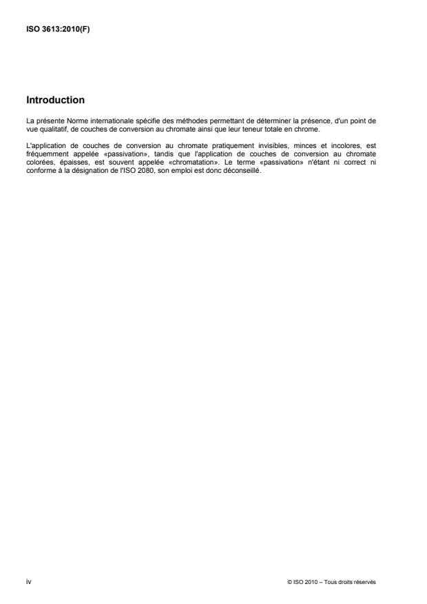 L'ISO 3613:2010 spécifie des méthodes permettant de déterminer la présence de couches de conversion au chromate incolores, la présence de chrome hexavalent dans les couches colorées et incolores sur zinc, cadmium ou alliages d'aluminium-zinc (fraction massique d'aluminium de 55 %, dans une plage de 54 % à 56 %) et de zinc-aluminium (fraction massique d'aluminium de 5 %), la teneur totale en chrome par unité de surface sur zinc et cadmium, la masse par unité de surface des couches incolores et colorées, le degré d'adhérence des couches de conversion au chromate, et la qualité des couches de conversion au chromate.
