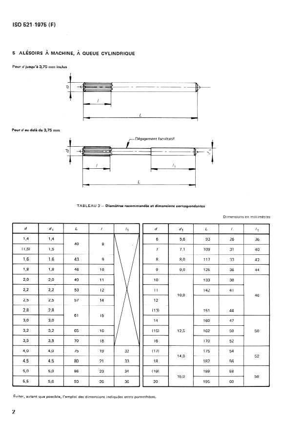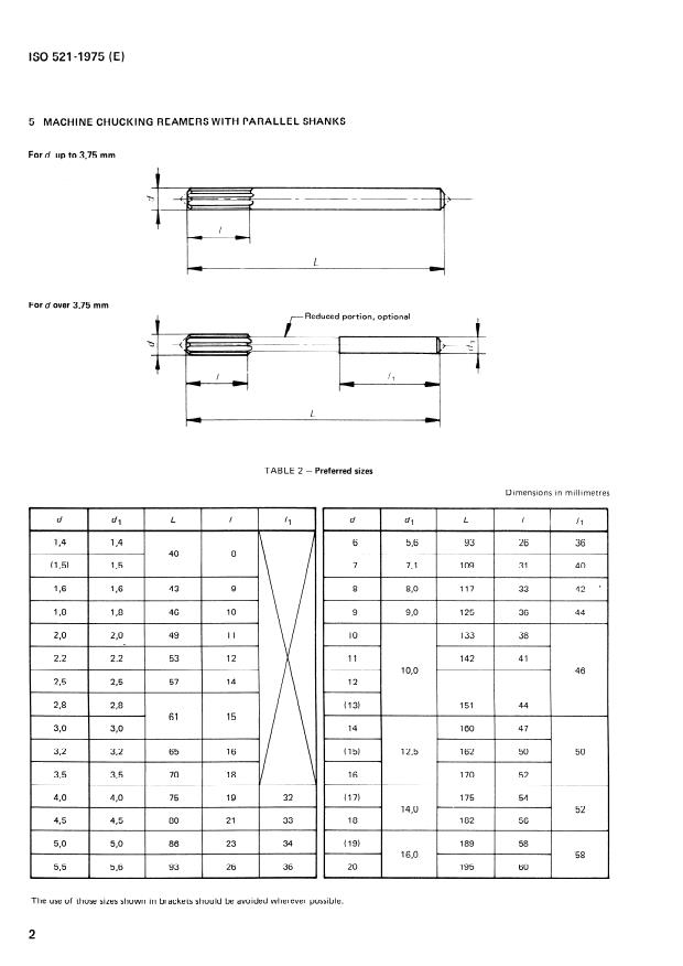 Lays down only metric dimensions. For each type of reamer mentioned above ISO 521 gives two tables, one showing preferred sizes with corresponding dimensions and the other, a general table set out as functions of diameter steps. Provision is also made for tolerances on length, cutting diameters and the diameters of parallel shank.