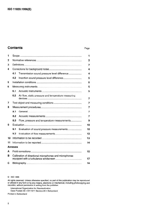 ISO 11820:1996 is a standard published by the International Organization for Standardization (ISO). Its full title is "Acoustics - Measurements on silencers in situ". This standard covers: Applies to measurements on silencers in practical applications for acoustic analysis, acceptance tests and similar evaluations. Depending on the method used, the measurement is either of insertion loss or transmission loss.