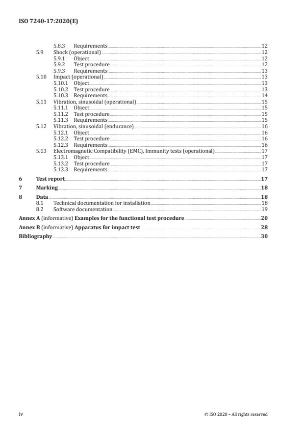 The standard provides informative annexes with examples for functional test procedures and apparatus for impact tests.