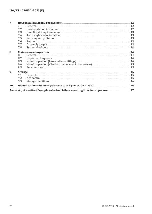 ISO/TS 17165-2:2013 provides guidelines for selection, routing, fabrication, installation, replacement, maintenance and storage of hose and hose assemblies for hydraulic fluid power systems which are manufactured from hoses conforming to ISO 1436, ISO 3862, ISO 3949, ISO 4079 and ISO 11237, and hose fittings conforming to ISO 12151-1 to ISO 12151-6. Many of these practices also can be suitable for use with other types of hoses and systems. ISO/TS 17165-2:2013 also lists examples of actual failure resulting from improper use of hydraulic hose and hose assemblies.