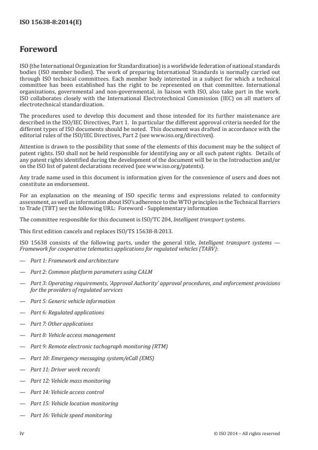 ISO 15638-8:2014 is a standard published by the International Organization for Standardization (ISO). Its full title is "Intelligent transport systems - Framework for cooperative telematics applications for regulated vehicles (TARV) - Part 8: Vehicle access management". This standard covers: ISO 15638-8:2014 addresses the provision of "vehicle access management" (and monitoring) and specifies the form and content of such data required to support such systems, and access methods to that data. ISO 15638-8:2014 provides specifications for common communications and data exchange aspects of the application service vehicle access monitoring that a regulator may elect to require or support as an option, including a) high level definition of the service that a service provider has to provide, (the service definition describes common service elements; but does not define the detail of how such an application service is instantiated, not the acceptable value ranges of the data concepts defined), b) means to realize the service, and c) application data, naming content, and quality that an IVS has to deliver.