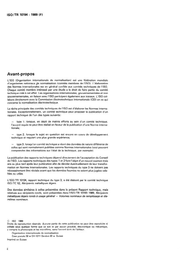 ISO/TR 10194:1989 - Récipients métalliques légers non ronds a usage général -- Volumes nominaux de remplissage et sections transversales nominales