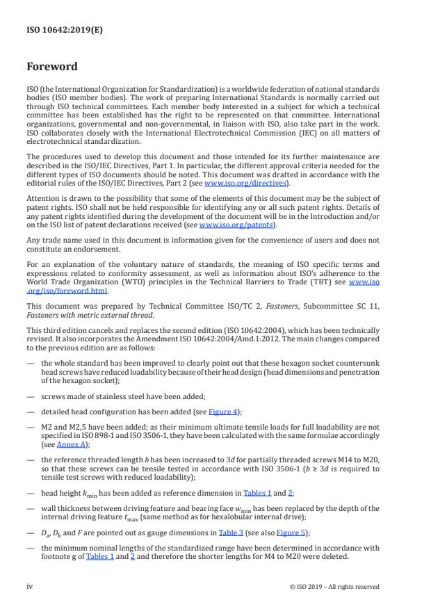 ISO 10642:2019 is a standard published by the International Organization for Standardization (ISO). Its full title is "Fasteners — Hexagon socket countersunk head screws with reduced loadability". This standard covers: This document specifies the characteristics of hexagon socket countersunk head screws with reduced loadability due to head design, in steel and stainless steel, with metric coarse pitch threads M2 to M20, and with product grade A. NOTE 1 Other dimensional options are given in ISO 888, ISO 965-1 and ISO 4753. NOTE 2 The reduced loadability (related to the countersunk head dimensions in combination with penetration of the hexagon socket specified in this document) implies a limitation of ultimate tensile load; see Table 5. NOTE 3 Particular attention is needed to ensure alignment of the countersunk head with the bearing surface of the countersink in the assembly.