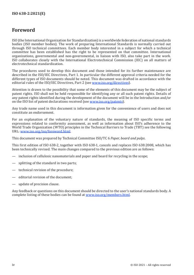 ISO 638-2:2021 is a standard published by the International Organization for Standardization (ISO). Its full title is "Paper, board, pulps and cellulosic nanomaterials — Determination of dry matter content by oven-drying method — Part 2: Suspensions of cellulosic nanomaterials". This standard covers: This document specifies an oven-drying method for the determination of the dry matter content in suspensions of cellulosic nanomaterials. The procedure is applicable to cellulosic nanomaterial suspensions which do not contain any appreciable quantities of materials other than water that are volatile at the temperature of 105 °C ± 2 °C. It is used, for example, in the case of cellulosic nanomaterial suspensions samples taken for chemical and physical tests in the laboratory, when a concurrent determination of dry matter content is required. NOTE 1: ISO 638-1[1] specifies the dry matter content in paper, board, pulp and cellulosic nanomaterials in solid form, which all can be produced from virgin and/or recycled materials; ISO 287[2] specifies the determination of moisture content of a lot of paper and board; ISO 4119[3] specifies the determination of stock concentration of aqueous pulp suspensions; ISO 801 (all parts)[4] specifies the determination of saleable mass in lots. NOTE 2: This document determines the total dry matter content of the sample, including any dissolved solids. If only the cellulosic material content free of dissolved solids is desired, dissolved solids are removed prior to measuring the dry matter content e.g. by washing or dialysis, taking care to retain all cellulosic material.