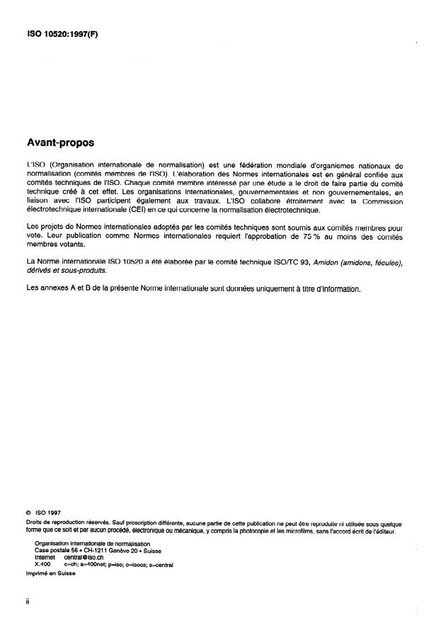 ISO 10520:1997 is a standard published by the International Organization for Standardization (ISO). Its full title is "Native starch — Determination of starch content — Ewers polarimetric method". This standard covers: La présente Norme internationale prescrit une méthode polarimétrique pour le dosage de l'amidon dans les amidons et fécules natifs, à l'exception de l'amidon à haute teneur en amylose. Elle n'est pas applicable aux amidons modifiés ou prégélatinés (solubles dans l'eau).