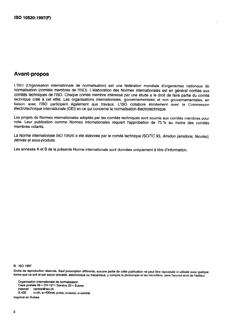 ISO 10520:1997 is a standard published by the International Organization for Standardization (ISO). Its full title is "Native starch - Determination of starch content - Ewers polarimetric method". This standard covers: La présente Norme internationale prescrit une méthode polarimétrique pour le dosage de l'amidon dans les amidons et fécules natifs, à l'exception de l'amidon à haute teneur en amylose. Elle n'est pas applicable aux amidons modifiés ou prégélatinés (solubles dans l'eau).