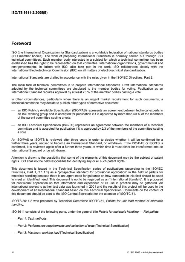 ISO/TS 8611-2:2005 is a technical specification published by the International Organization for Standardization (ISO). Its full title is "Pallets for materials handling — Flat pallets — Part 2: Performance requirements and selection of tests". This standard covers: ISO 8611-2:2005 specifies the performance requirements and the selection of tests for flat pallets of all materials being subjected to the tests defined in ISO 8611-1. It is not intended to apply to pallets with a fixed superstructure or a rigid, self-supporting container that may be mechanically attached to the pallet and which contributes to the strength of the pallet.
