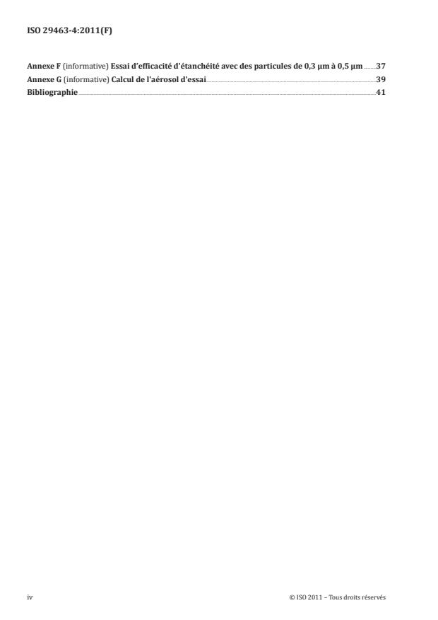 ISO 29463-4:2011 specifies the test procedure of the "scan method", considered to be the reference method, for determining the leakage of filter elements. It is applicable to filters ranging from classes ISO 35 H to ISO 75 U. ISO 29463-4:2011 also describes the other normative methods: the oil thread leak test and the photometer leak test, applicable to classes ISO 35 H to ISO 45 H HEPA filters, and the leak test with solid PSL aerosol. ISO 29463-4:2011 is intended for use in conjunction with ISO 29463-1, ISO 29463-2, ISO 29463-3 and ISO 29463-5.