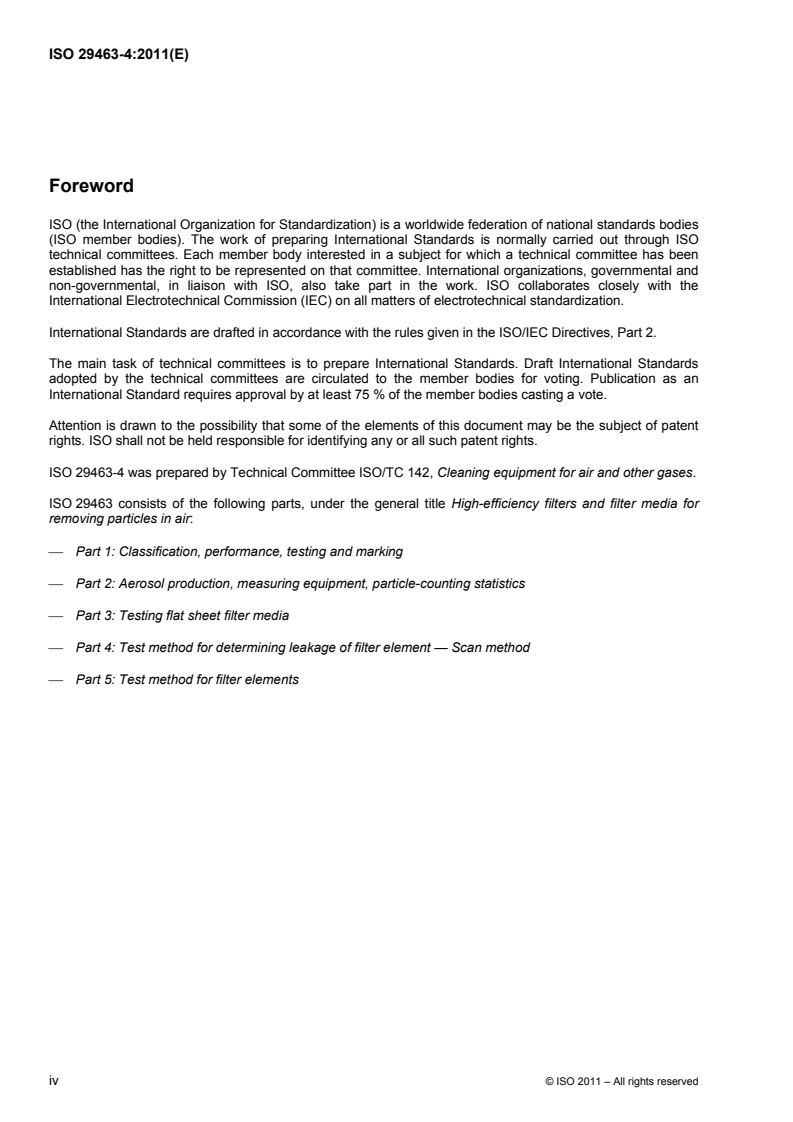 ISO 29463-4:2011 is a standard published by the International Organization for Standardization (ISO). Its full title is "High-efficiency filters and filter media for removing particles in air - Part 4: Test method for determining leakage of filter elements-Scan method". This standard covers: ISO 29463-4:2011 specifies the test procedure of the "scan method", considered to be the reference method, for determining the leakage of filter elements. It is applicable to filters ranging from classes ISO 35 H to ISO 75 U. ISO 29463-4:2011 also describes the other normative methods: the oil thread leak test and the photometer leak test, applicable to classes ISO 35 H to ISO 45 H HEPA filters, and the leak test with solid PSL aerosol. ISO 29463-4:2011 is intended for use in conjunction with ISO 29463-1, ISO 29463-2, ISO 29463-3 and ISO 29463-5.
