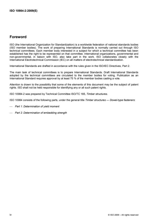 ISO 10984-2:2009 specifies laboratory methods for determining the embedding strength of solid timber, glued laminated timber and wood-based sheet products with dowel-type fasteners. Descriptors: timber construction, fasteners, nails (fasteners), bolts, tests, compression tests, determination, compressive strength