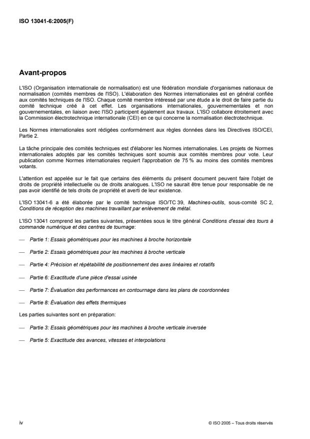 L'ISO 13041 comprend les parties suivantes, présentées sous le titre général Conditions d'essai des tours à